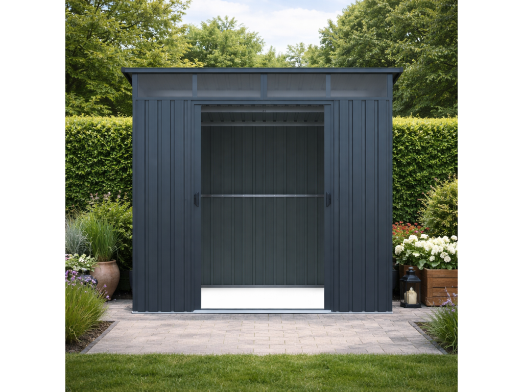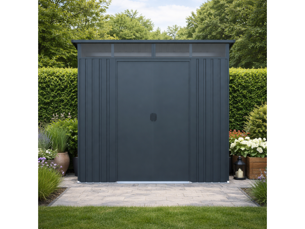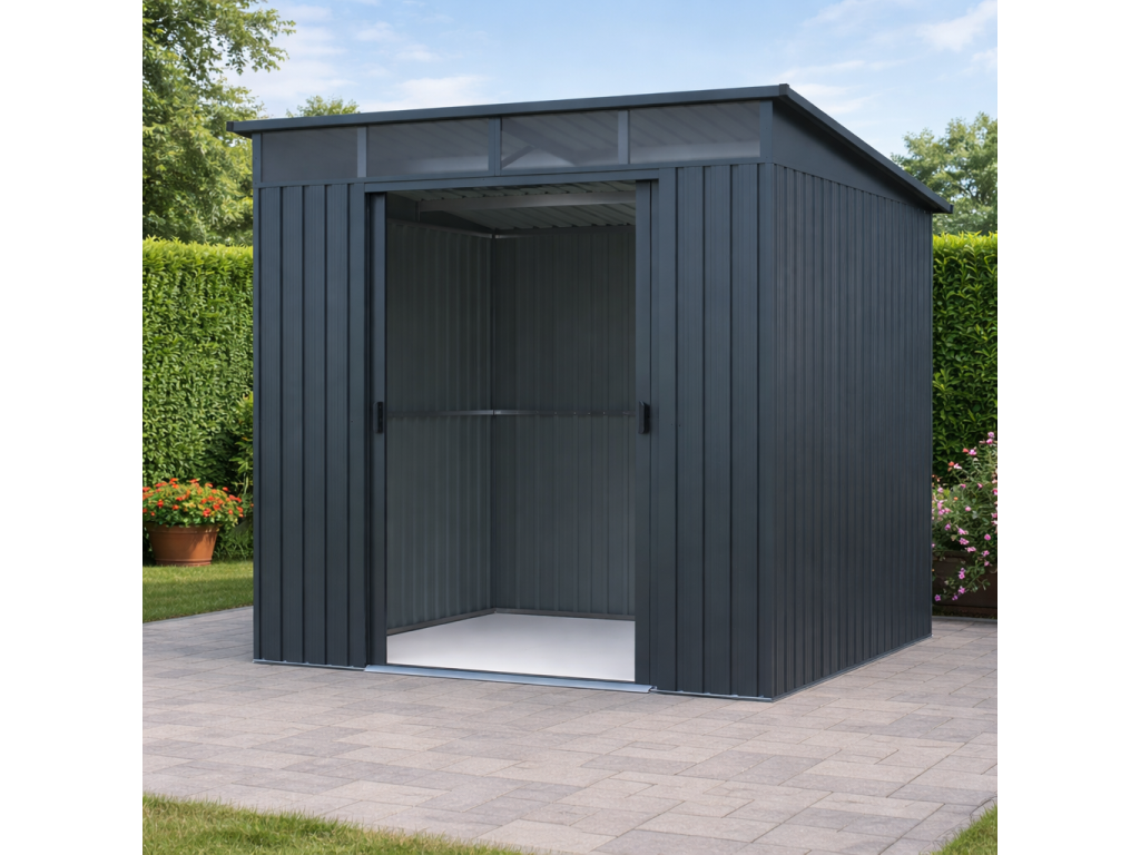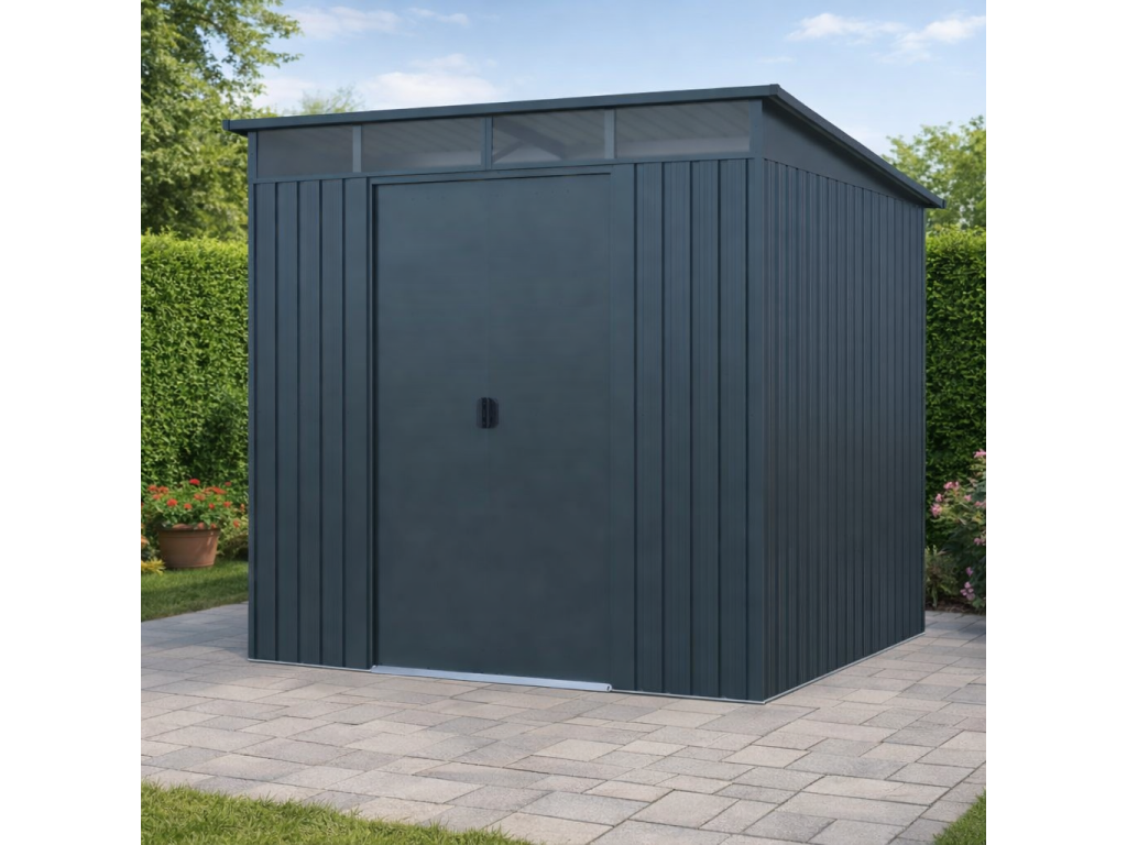 Moderní design s praktickým světlíkemKvalitní zahradní domek v elegantním antracitovém nebo bílém provedení skvěle zapadne do každé zahrady i dvora. Díky ploše 5,6 m² poskytuje dostatek prostoru pro uskladnění zahradní techniky i dalšího vybavení. Světlík z odolného polykarbonátu přivádí do interiéru přirozené světlo, takže se uvnitř pohodlně pohybujete i bez nutnosti umělého osvětlení. TIP: Pultová střecha nejen moderně vypadá, ale zároveň umožňuje efektivní odtok dešťové vody.