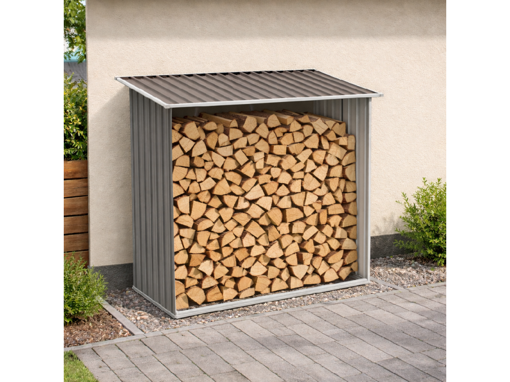Moderní design a praktické rozměryKompaktní, ale dostatečně prostorný dřevník v šedém provedení snadno zapadne ke každému domu i zahradě. Díky rozměrům 163 × 83 × 154 cm poskytuje úložnou plochu 1,35 m² a objem až cca 2 m³. Šikmá střecha se sklonem (zadní výška 154 cm, přední 142 cm) zajišťuje přirozený odtok vody. TIP: Umístěte dřevník ke zdi domu nebo garáže – zvýšíte stabilitu a zároveň ušetříte místo na zahradě.