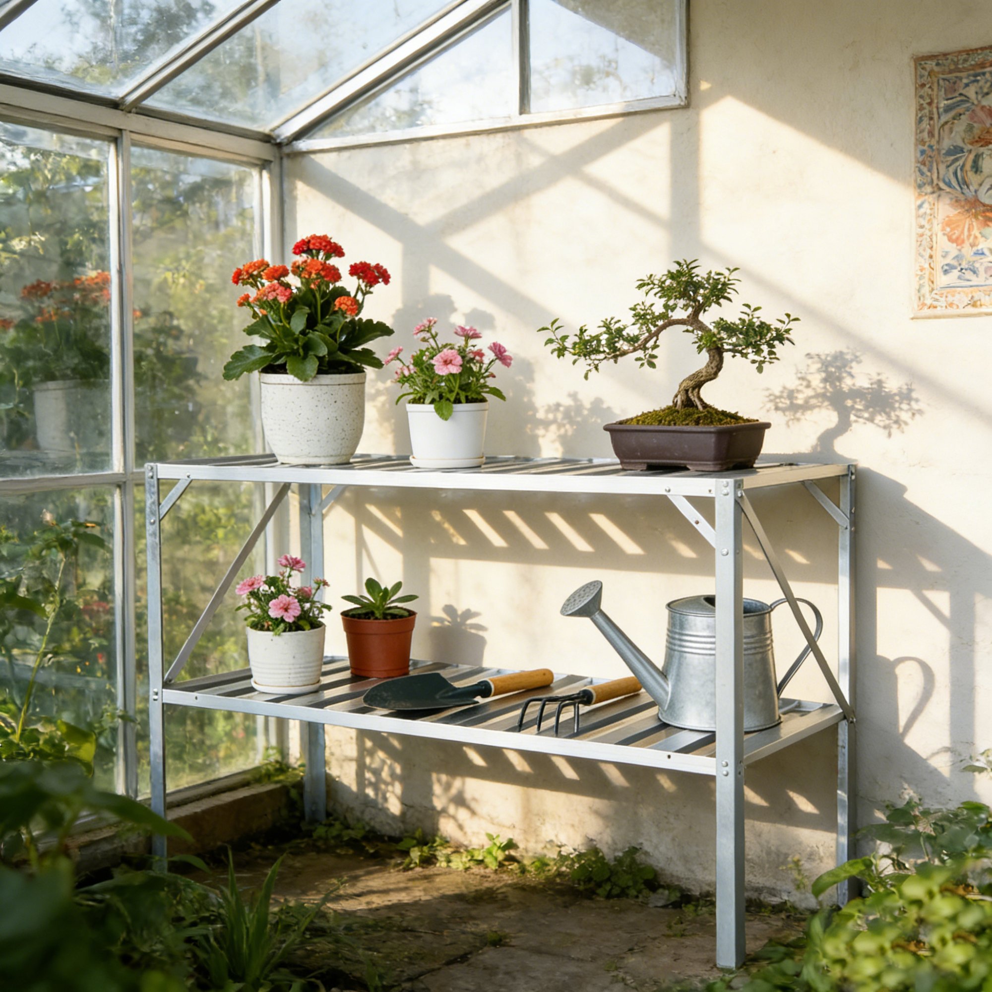 Praktické řešení pro váš skleníkDvoupolicový regál je navržen tak, aby dokonale zapadl do většiny standardních skleníků. Pomáhá efektivně využít výšku prostoru a rozšířit pěstební plochu. Poskytuje dostatek místa pro sadbovače, květináče i zahradní nádoby a umožňuje lepší organizaci prostoru. TIP: Umístěním rostlin na vyvýšenou polici zajistíte lepší přístup světla i pohodlnější manipulaci.