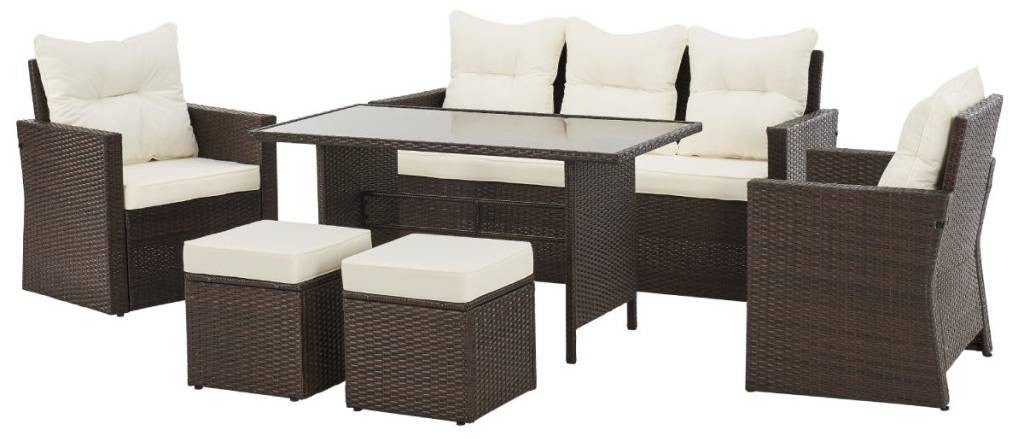 Součástí setu jsou také dvě podnožky, které lze využít k pohodlnému natažení nohou nebo jako další sedací prostor. Podnožky jsou stejně jako sedačka a křesla vybaveny měkkými polštářky pro maximální pohodlí. Prostorný zahradní stůl s tvrzeným sklem dodává setu moderní a elegantní vzhled. Tvrzené sklo je odolné a snadno se udržuje, což zajišťuje dlouhou životnost a praktické využití stolu. Na stůl můžete umístit nápoje, občerstvení nebo dekorace a vytvořit tak útulný a stylový prostor pro vaše venkovní posezení.