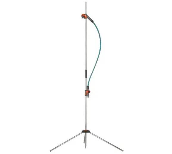Zahradní sprcha se stativem od značky GARDENA nabízí stejně komfortní zážitek jako sprcha v koupelně. Díky stabilní trojnožce ji můžete snadno umístit kamkoliv na zahradu. Sprchová hlavice je flexibilní a odnímatelná, připojená k hadici dlouhé 1,3 metru, což vám poskytuje větší volnost při sprchování venku. Nabízí dva typy proudu vody: jemné vějířové stříkání pro sprchování nebo jemné mžení pro osvěžení. Výšku sprchy lze jednoduše nastavit pomocí tlačítka, takže ji můžete přizpůsobit jakékoli postavě. Průtok vody je pak snadno regulovatelný pomocí ventilu, který umožňuje nastavit požadovaný tlak a uzavření vody.