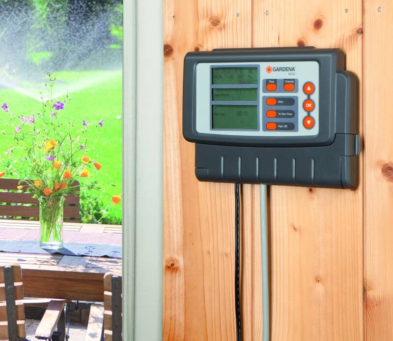 Prostřednictvím hlavního kanálu lze připojit také systém pro řízení čerpadla, a čerpadlo tak lze ovládat jako alternativní zdroj vody. Zavlažovací počítač lze používat ve vnitřních prostorách, např. v garáži a v prostorách chráněných před deštěm, a má připojení k 230 V napájení. Aby řízení zavlažování spolehlivě a bezpečně fungovalo, je možné zajistit ochranu proti výpadku napájení pomocí 9 V alkalického akumulátoru (není součástí dodávky). Je-li to nutné, lze připojit čidlo půdní vlhkosti nebo dešťový senzor pro provoz s úsporou vody.