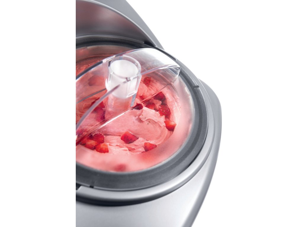 Velice praktické je průhledné hermeticky uzavíratelné víko, které udržuje správnou teplotu uvnitř nádob. Navíc máte přehled o tom, co se uvnitř zmrzlinovače děje. Speciální lopatky zmrzlinu perfektně promíchají, takže se můžete těšit na tu správnou konzistenci přesně tak, jak ji máte nejraději. Jak lopatky, tak i vyjímatelné nádobky na zmrzlinovou směs a víko jsou omyvatelné v myčce, i manuální mytí je však velice snadné. Protiskluzové nožičky zajišťují stabilitu celého přístroje.
