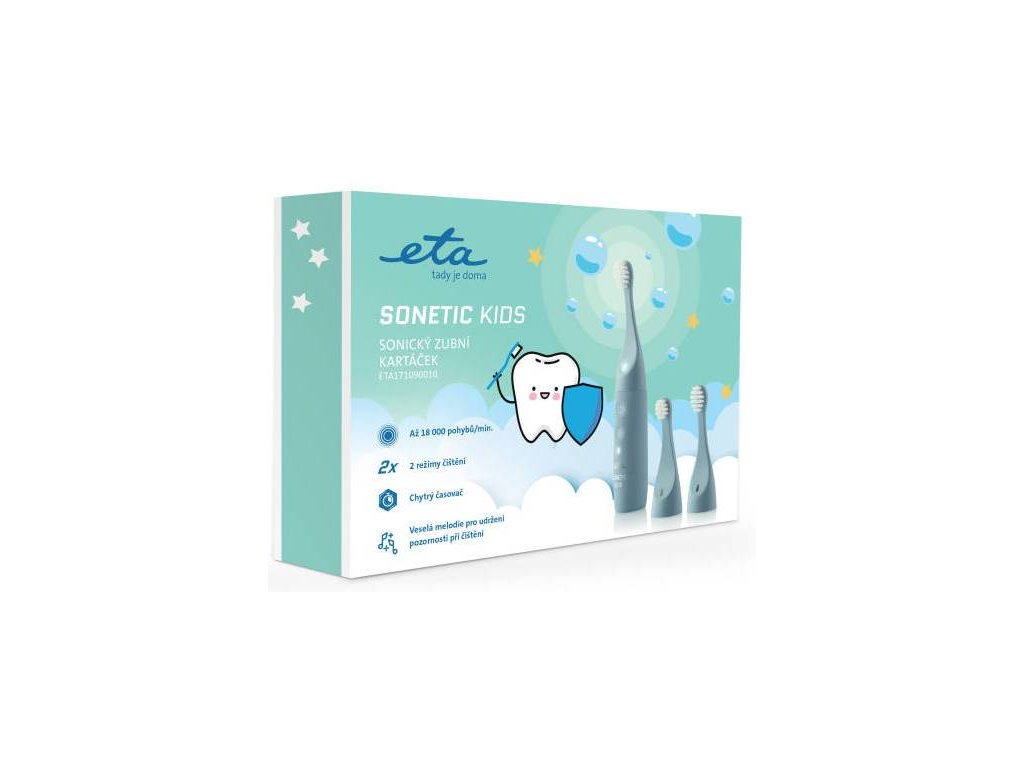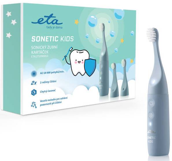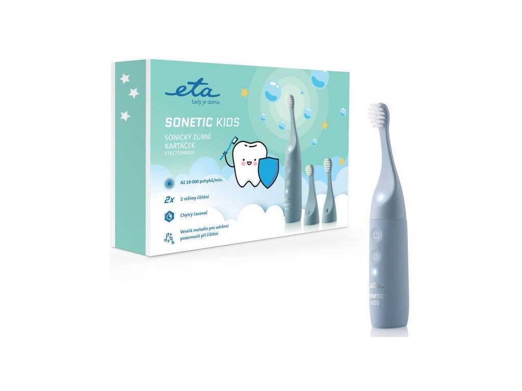 Pro efektivní a zábavné čištění dětských zubů je ideální sonický kartáček ETA 1710 90010. Díky veselé melodii se stane čištění pro děti hrou. Tento kartáček je šetrný k citlivým dětským dásním a zubům díky jemným štětinám DuPont. S technologií microBUBBLES a MOVE+ účinně odstraňuje plak a bakterie. Kartáček má zabudovanou 3,7V Li-Ion baterii a snadno se nabíjí přes micro USB kabel (součástí balení). Na jedno nabití vydrží až 100 čisticích cyklů. Má také příjemný měkčený povrch, který usnadňuje držení a voděodolné provedení IPX7. V balení najdete dvě hlavice, jednu pro děti od 1 do 3 let a druhou pro děti od 3 do 6 let.